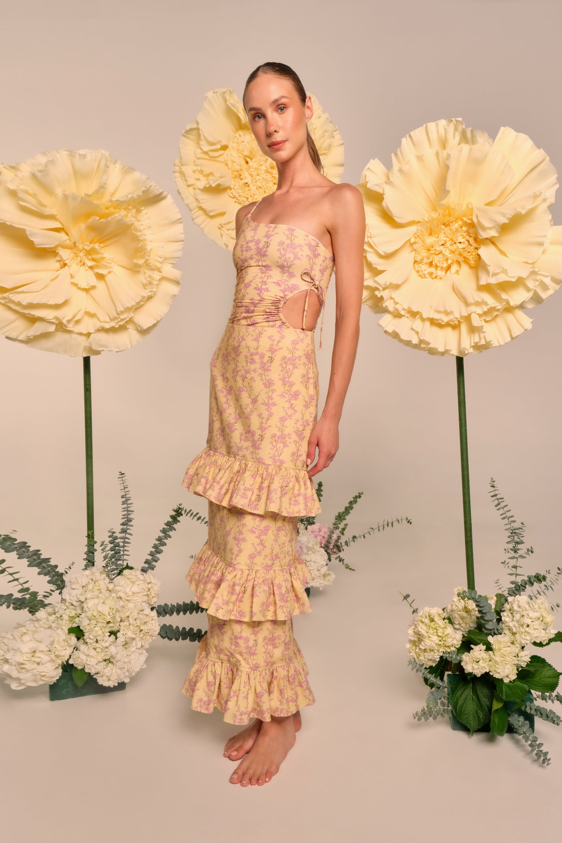 An elegant one-shoulder silhouette with a romantic botanical print. Soft ruching and adjustable side ties sculpt the waist and create a graceful cut-out effect, while the high-leg line elongates the figure. Crafted in smooth, supportive swim fabric for a flattering, comfortable fit from poolside to golden hour.