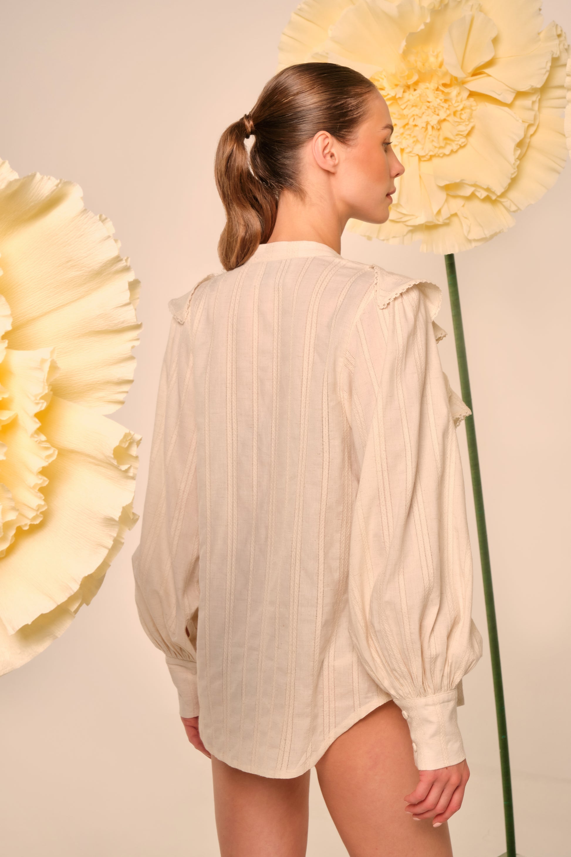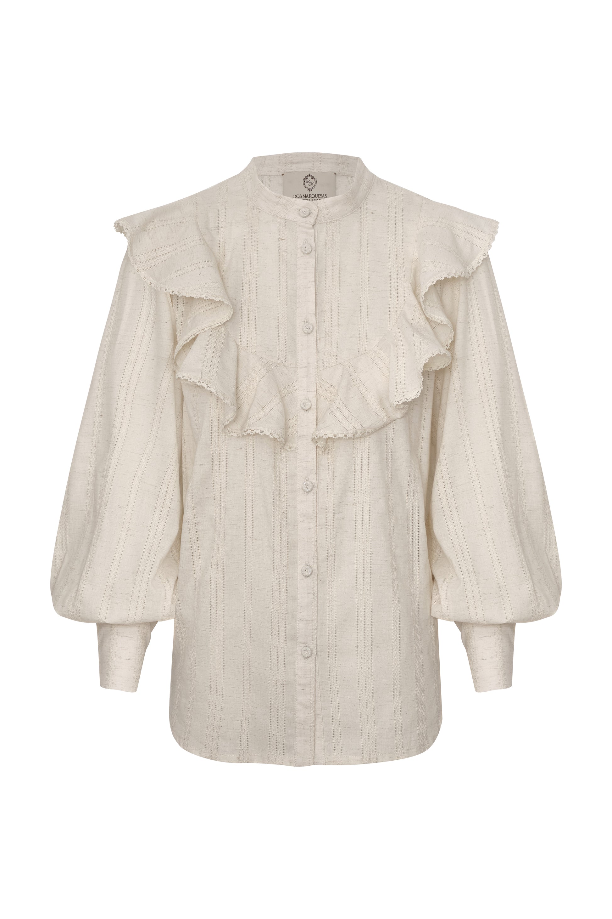 A romantic, cotton blouse with soft texture and airy volume. The ruffled yoke frames the neckline and shoulders, while billowed sleeves and buttoned cuffs add an effortless, feminine silhouette. Finished with a classic button front for day-to-dusk ease.