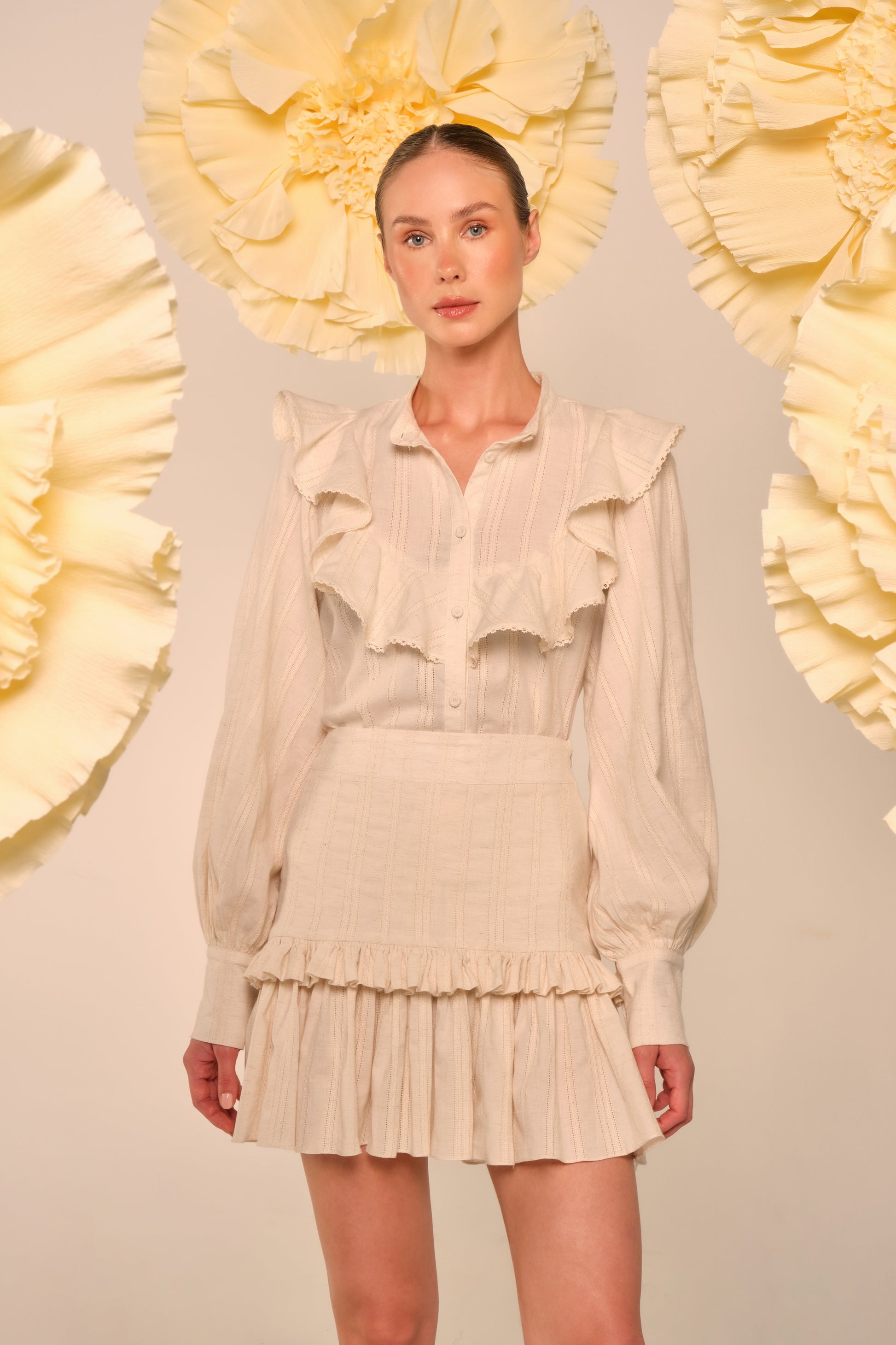 A breezy mini skirt with soft volume and romantic movement. Cut to a flattering high waist, it features a delicate ruffle tier and a lightly textured cotton that feels cool against the skin—perfect for sun-lit days and effortless evenings.