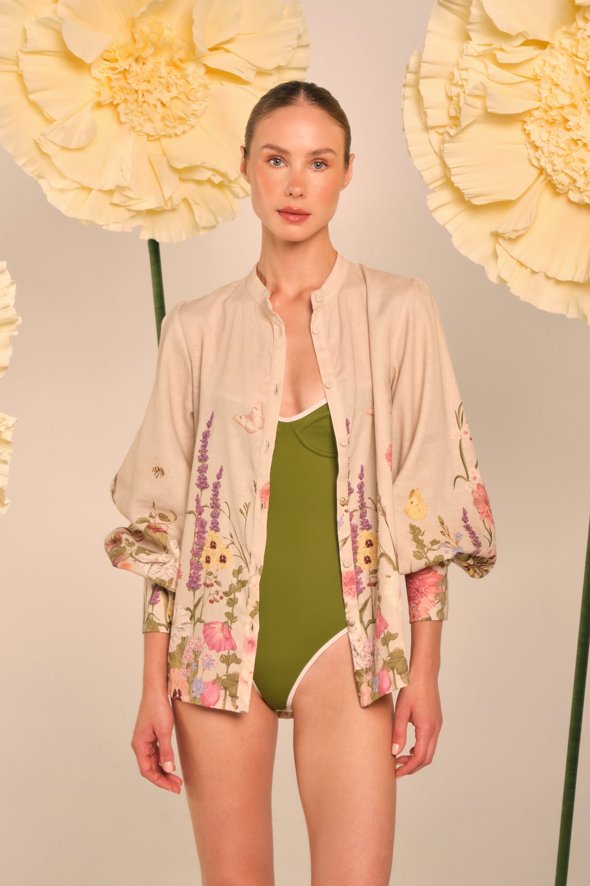 A breezy, beige resort blouse with our garden-inspired border print, made to work double-duty. Wear it open as a blouson cover-up over your favorite swimsuit for effortless beach-to-lunch style, or buttoned as a polished summer blouse with shorts, skirts, or linen pants.