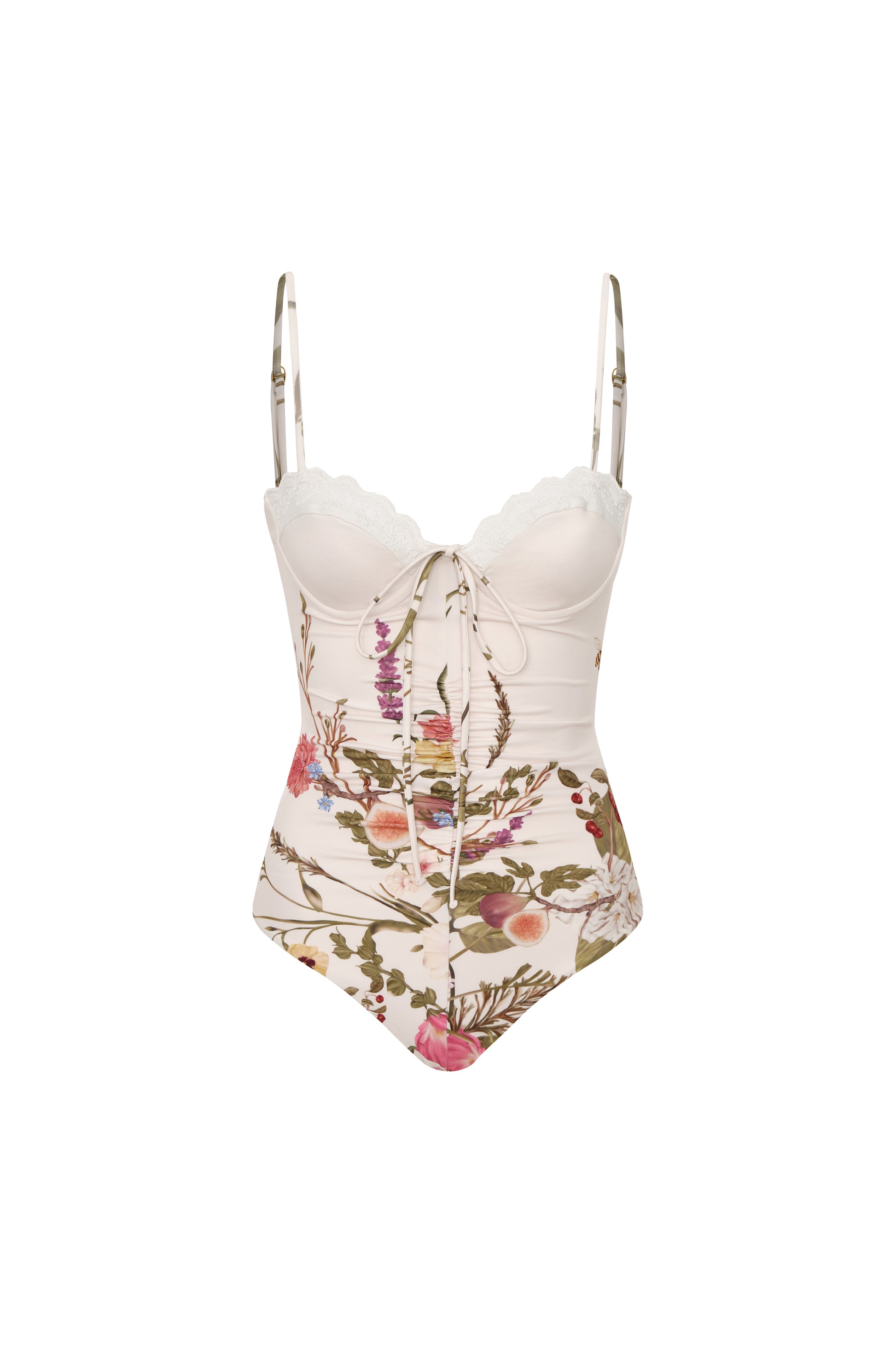 A vintage-inspired one-piece in our romantic botanical print. Balconette cups framed with delicate scalloped lace shape the bust, while the lace-up front lets you personalize the fit. Gentle ruching through the torso smooths and flatters, and the high-leg cut offers elegant, confident coverage from sunrise to sunset.