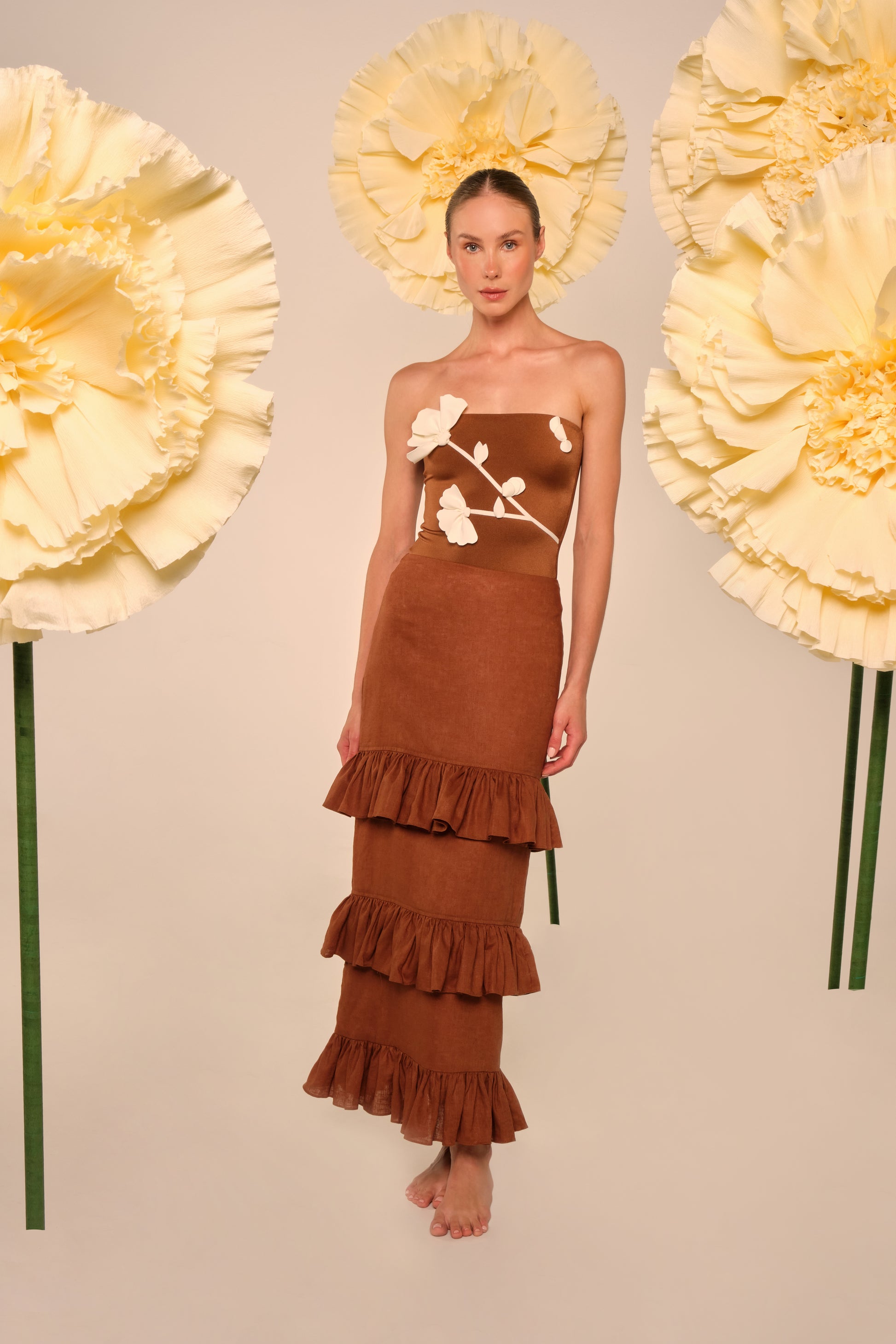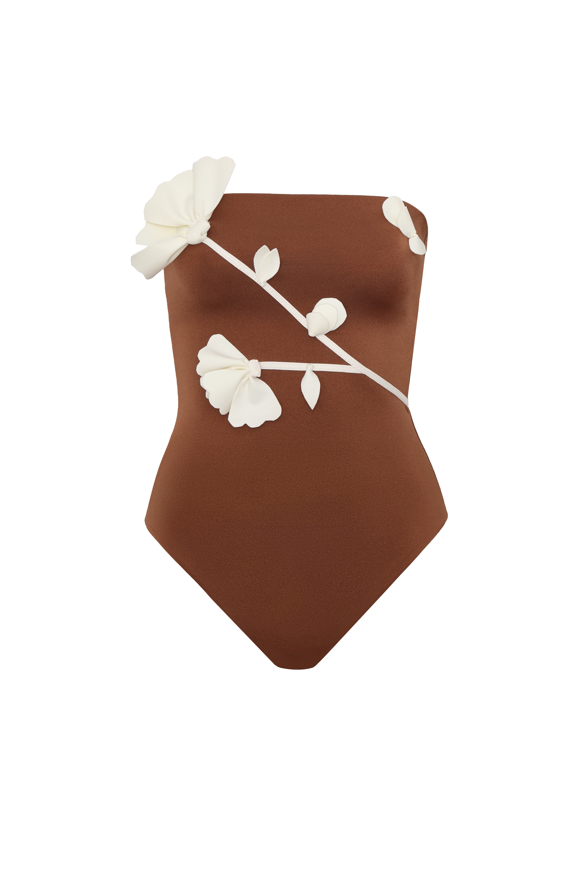 Our best-selling one-piece, celebrated for its sculpting silhouette and signature 3D floral artwork. Each petal and leaf is individually hand-cut and hand-applied by our artisans, creating a delicate vine that traces the body and makes every piece subtly unique. The clean, strapless neckline and smooth, supportive fabric flatter the figure with elegant ease from poolside to sunset.
