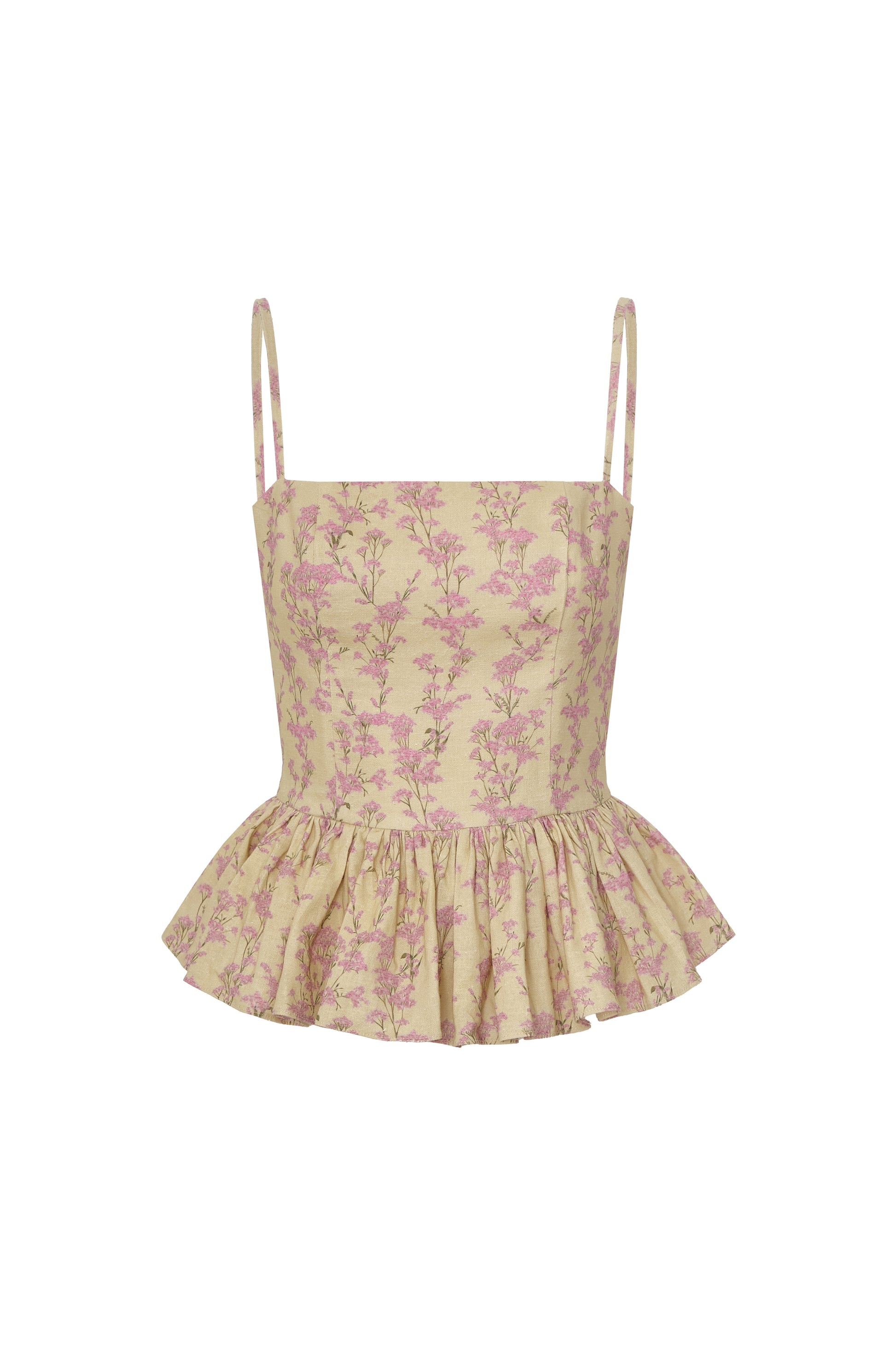 An airy cropped silhouette in our romantic lavender-botanical print. Designed to sit just above the waist, it pairs effortlessly with high-rise pieces and moves with a soft, feminine drape. Cut from lightweight woven fabric for a breathable feel from day to dusk.